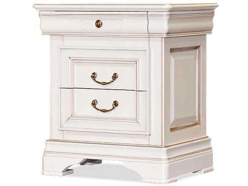 Изящная прикроватная тумба «Влада» ММ-160-03 с тремя ящичками от белорусских мебельщиков фабрики «Молодечномебель» не только украсит спальню, но и поможет хранить множество мелких предметов. Красивая резьба и состаренная фурнитура этой модели отлично соответствуют классическому стилю.